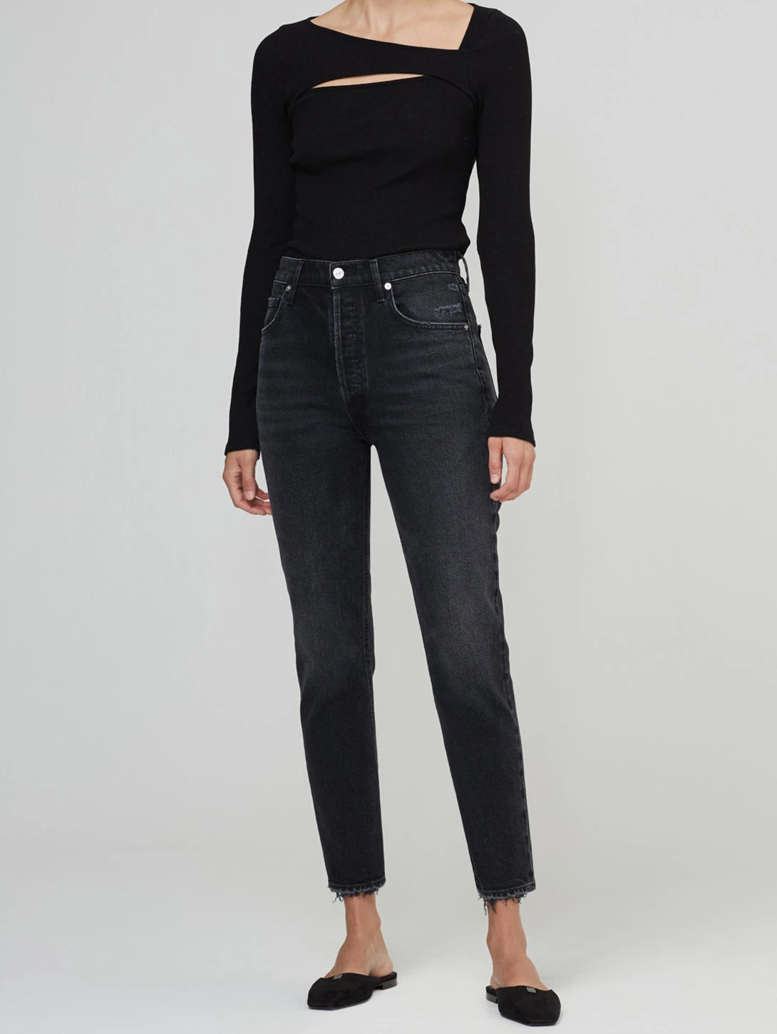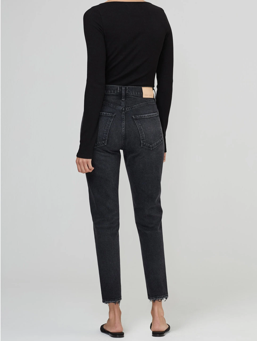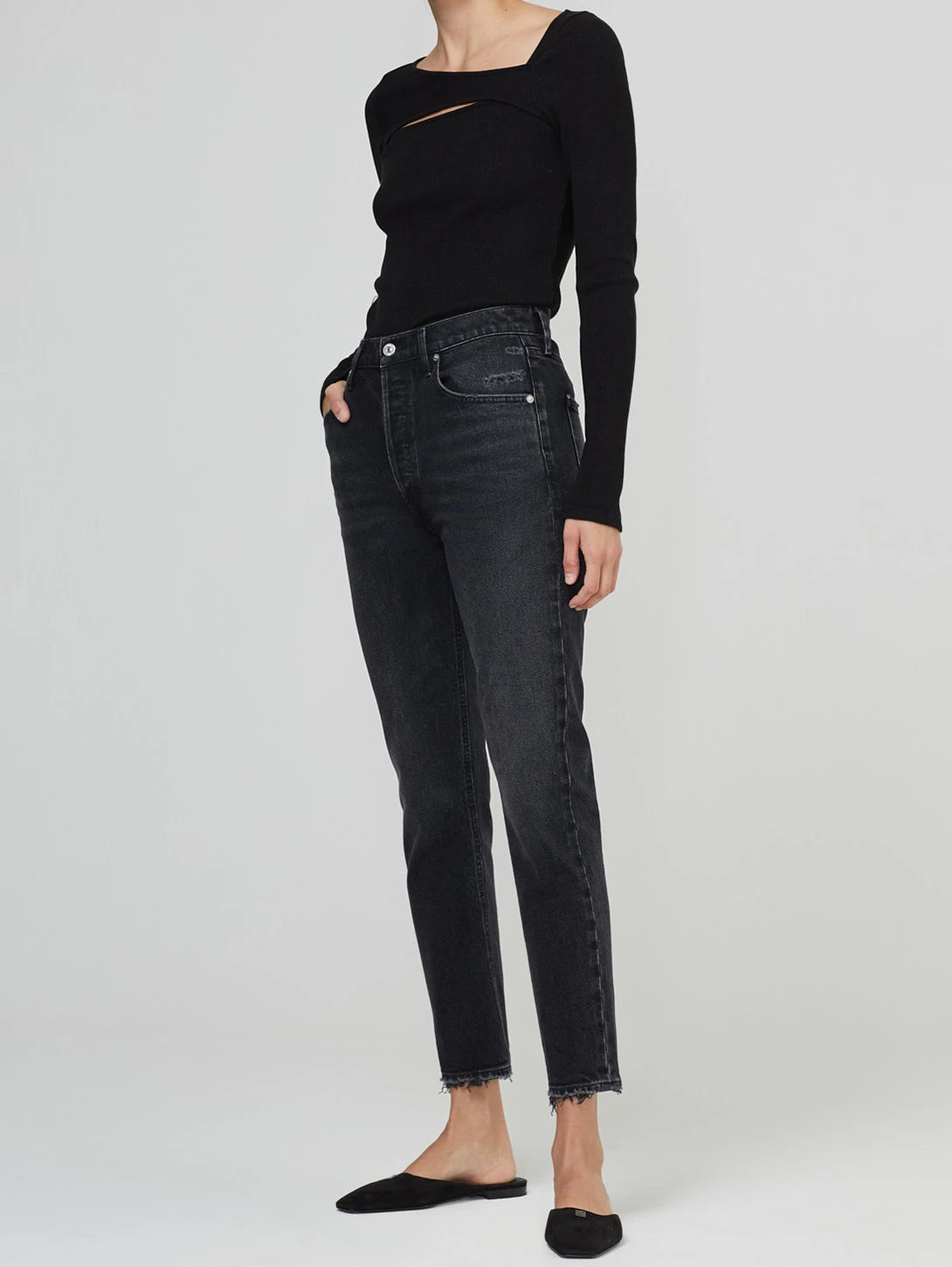 Jolene is a high-rise vintage slim straight, sitting right at the waist and perfectly contoured through the hip to the thigh for an incredibly contoured fit. These jeans is made from comfort stretch denim in a vintage medium-washed black wash.Â