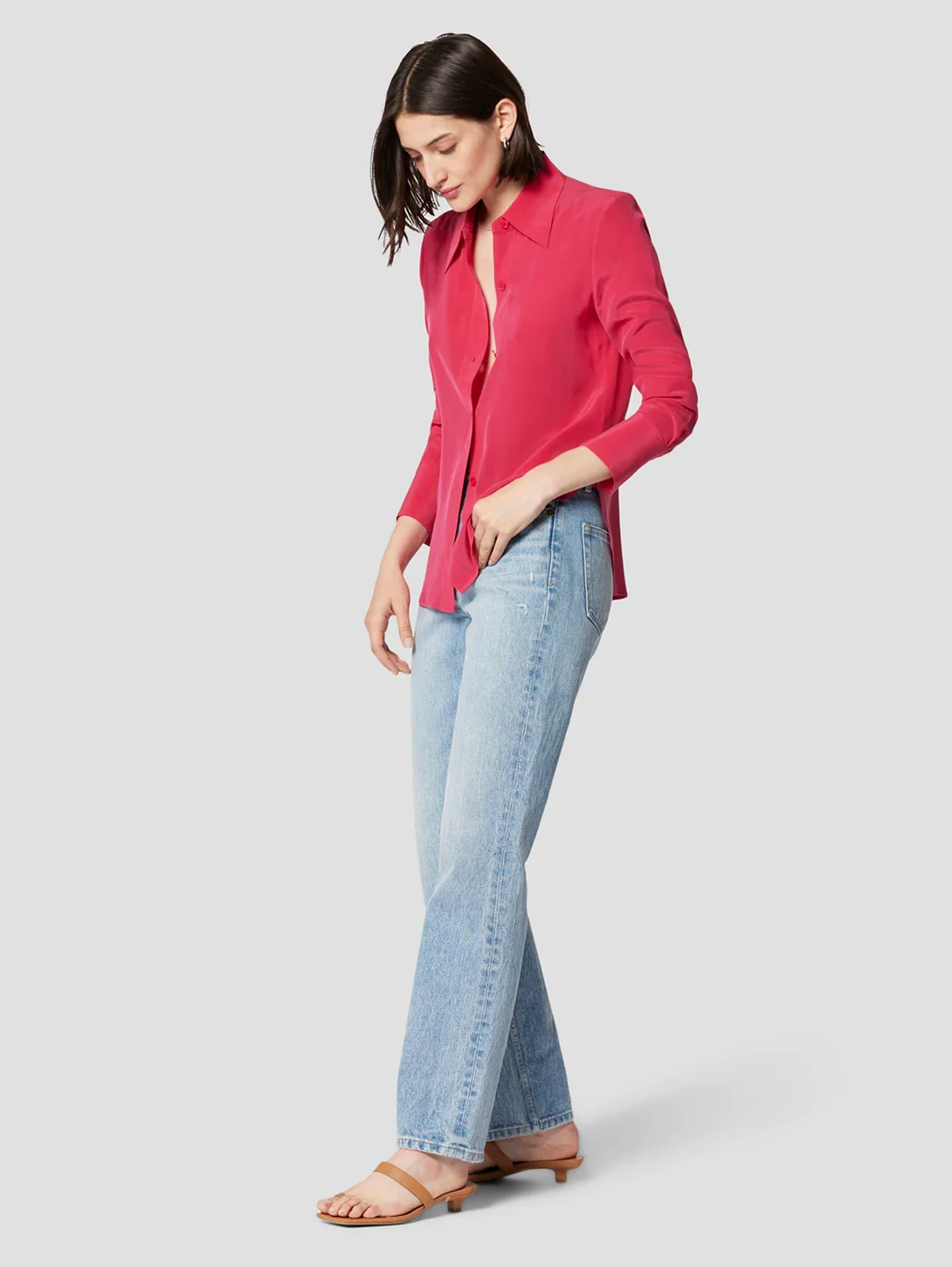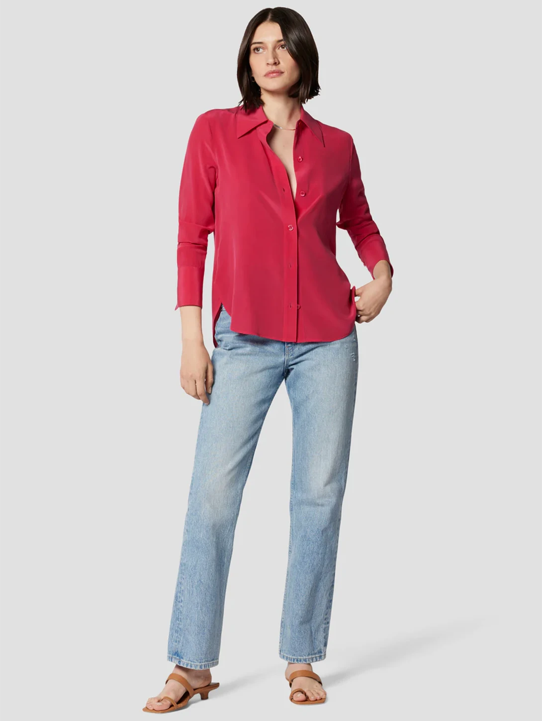 Leona shirt is crafted from 100% Silk, featuring long sleeves, an exaggerated collar and front button closure. Lightweight with a slim and flattering fit in luminous silk satin.