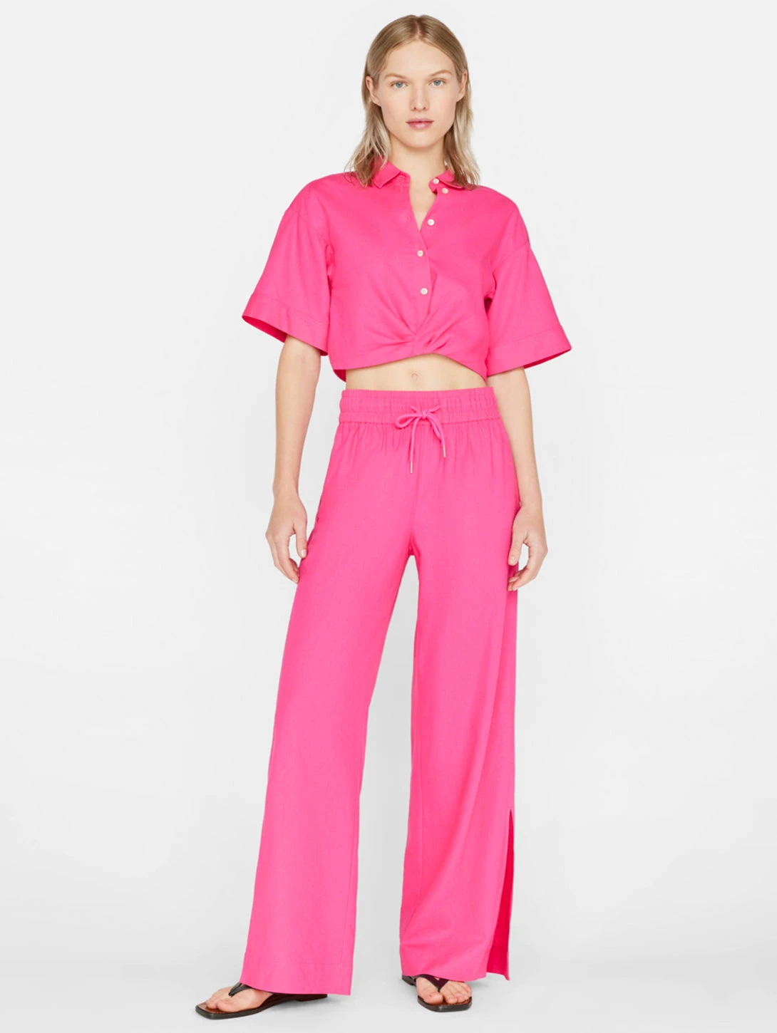 One-half of the most vibrant leisure set your carry-on has ever seen, the high slits on the breezy wide legs of these linen drawstring pants elevate them from loungewear to wear-to-the-cocktail-lounge wear. This pant features a high-rise elastic waist with drawcords, and zip pockets at each side.