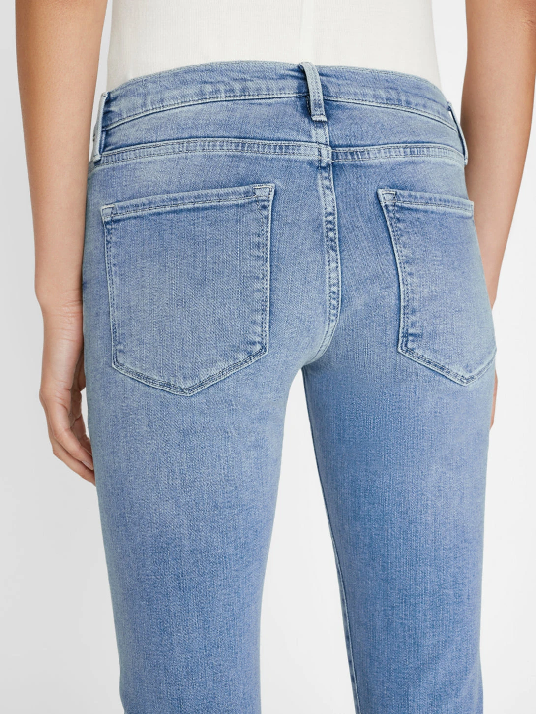 Galeston is a mid-rise skinny jean and a slouchier take on the classic boyfriend silhouette. The curved waist features a slightly higher rise in the back, for a comfortable hip-slung fit. This pair is crafted from super stretch denim in a light-blue wash and finished with a cuffed hem.