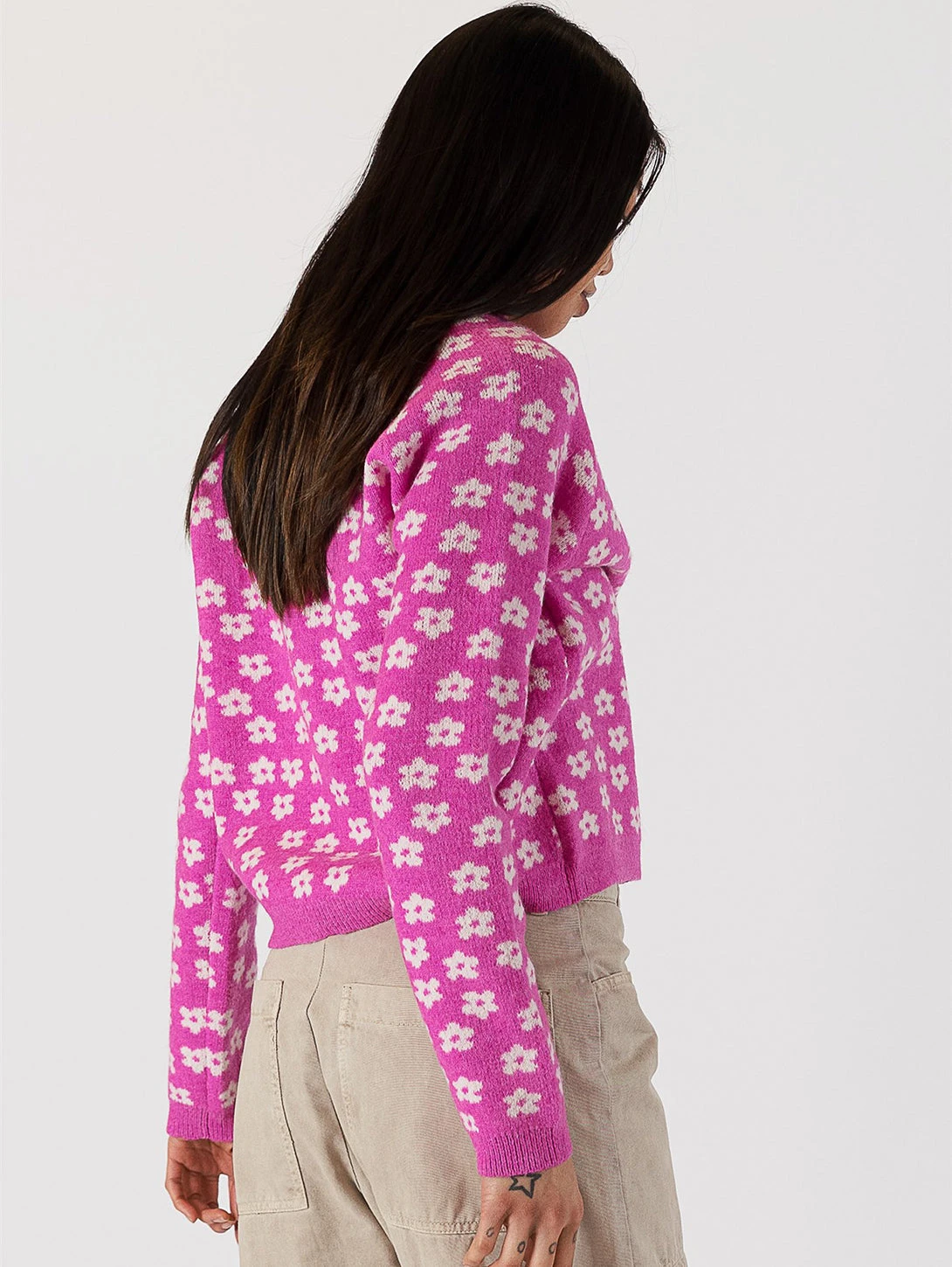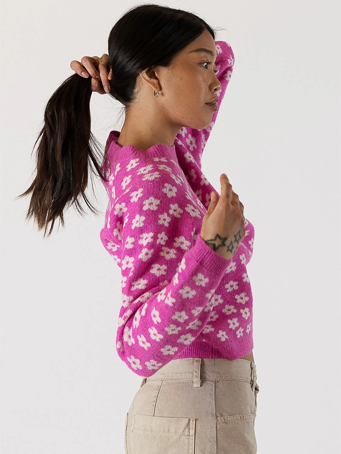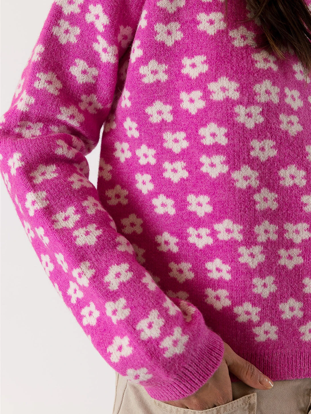 A delightful and feminine addition to your fall and winter wardrobe. This sweater features a charming flower print that adds a touch of elegance and whimsy to your outfit. The crewneck design offers a classic and versatile style that can be dressed up or down for various occasions.