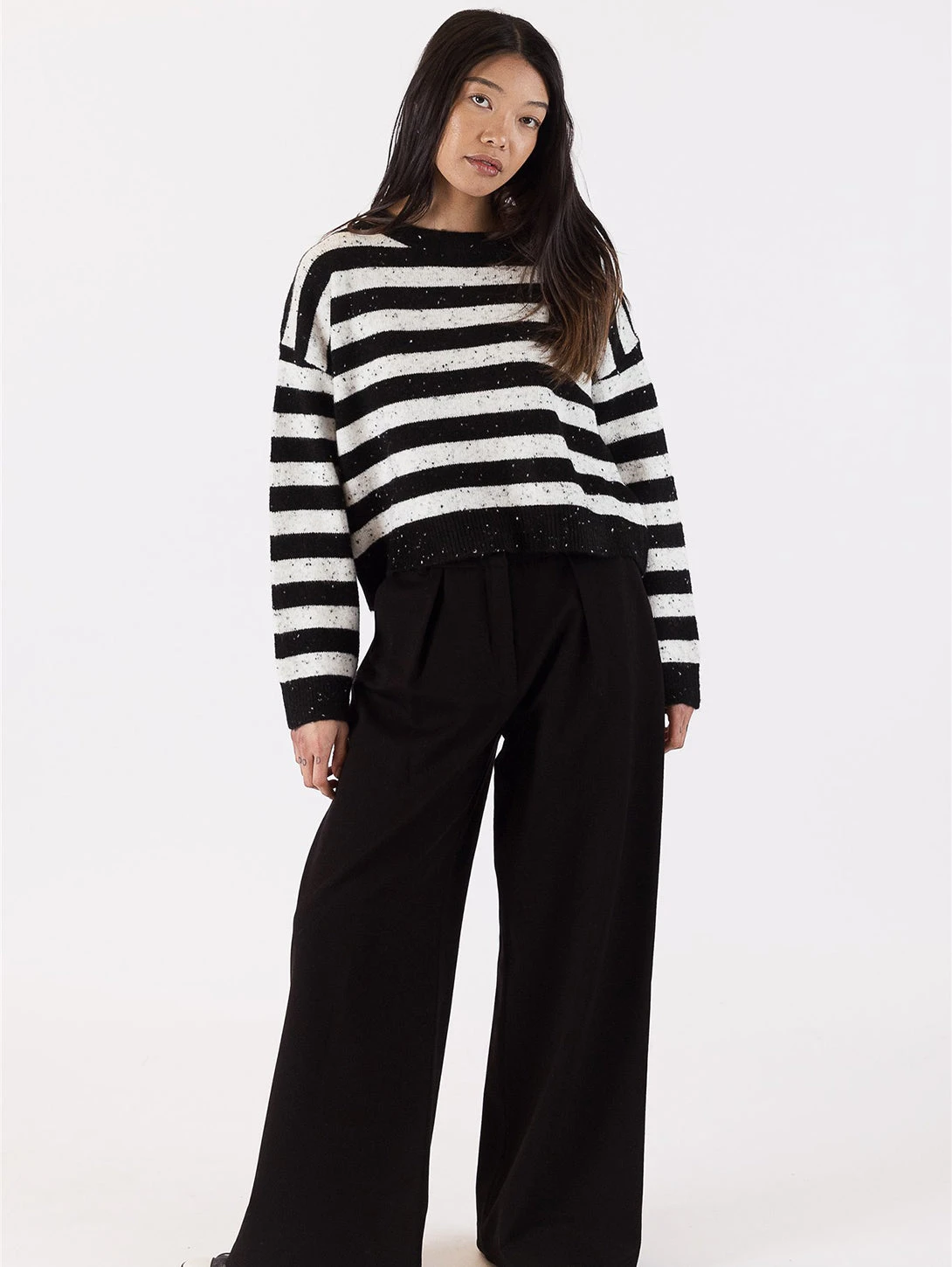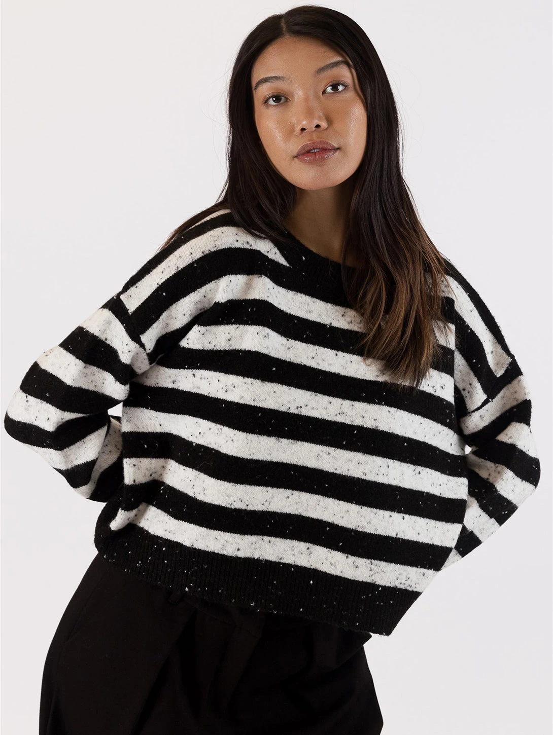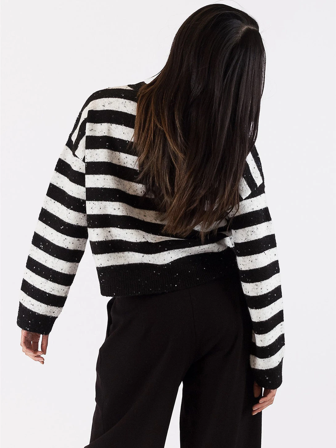 A contemporary and eye-catching addition to your knitwear collection. This sweater features a stylish striped pattern with a twist – subtle flecks of colour woven throughout, adding a touch of texture and visual interest. The combination of classic stripes and the unique flecked design creates a modern and playful look that is sure to turn heads.
