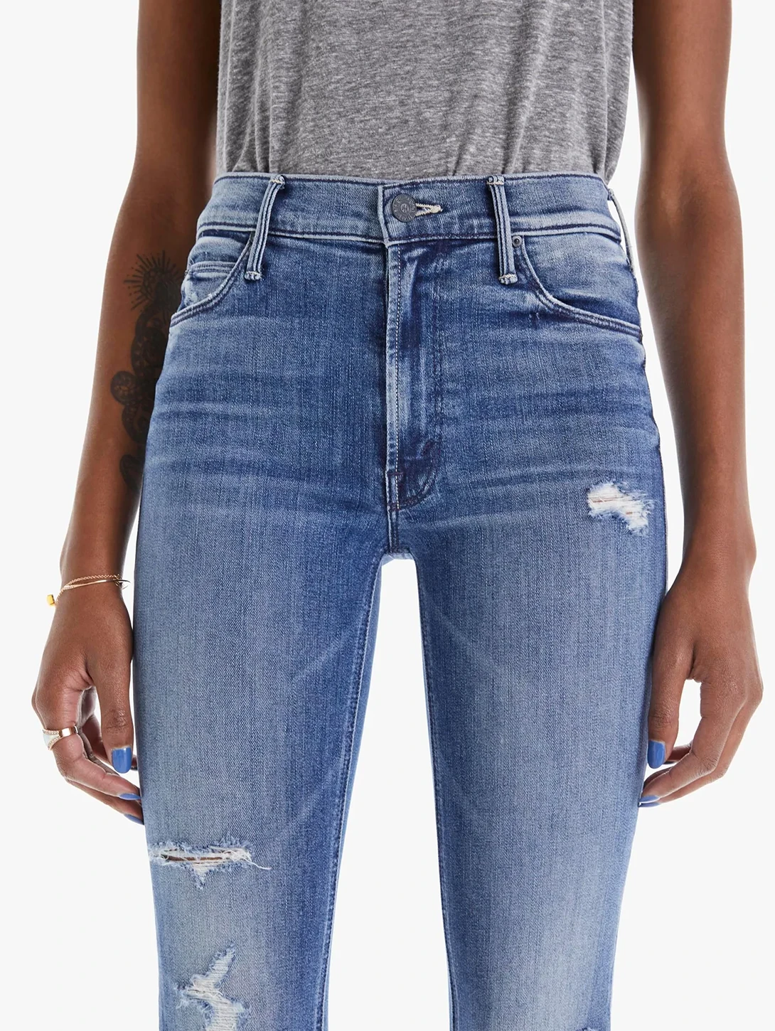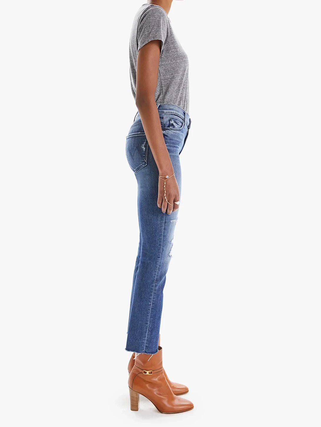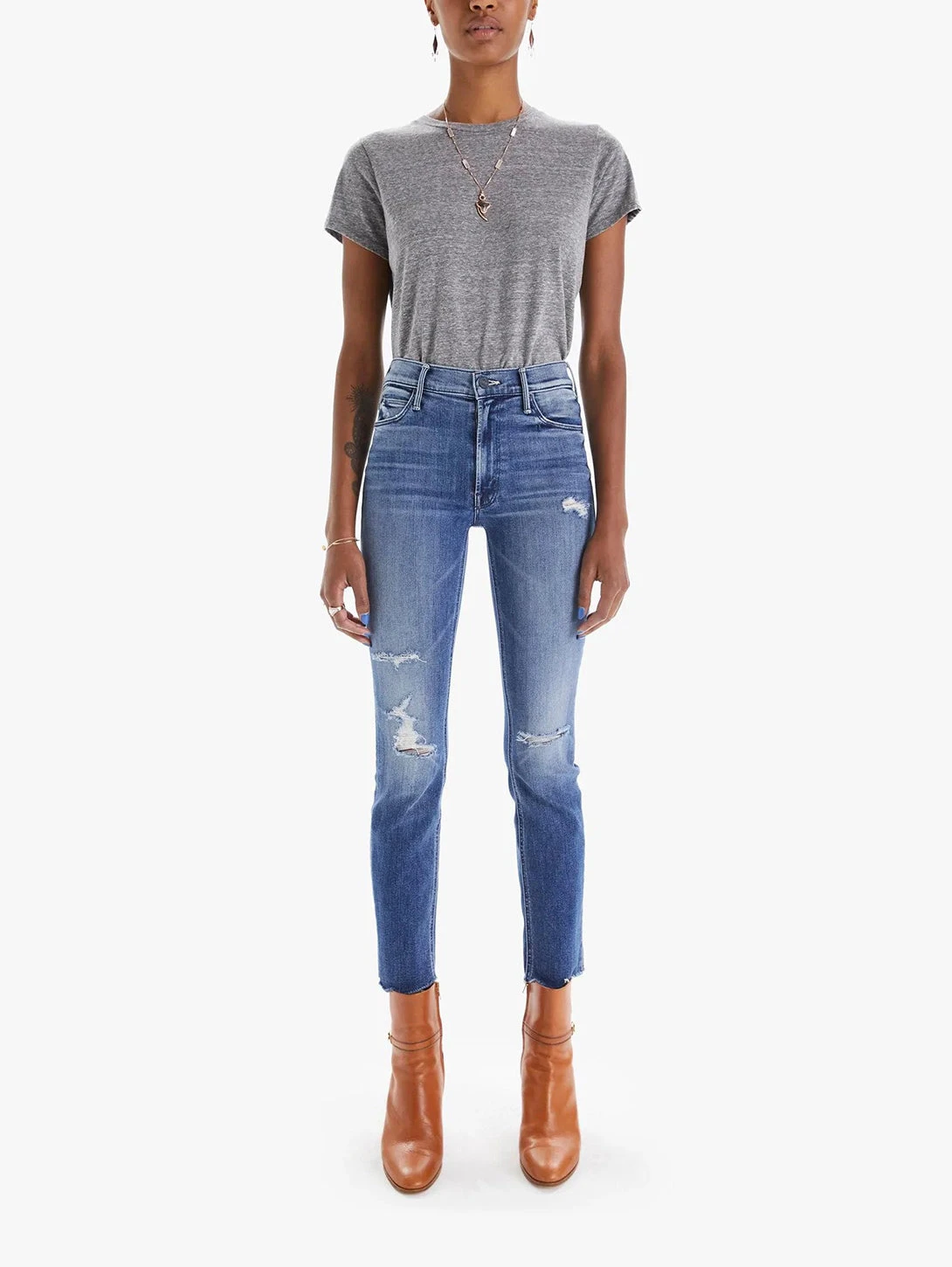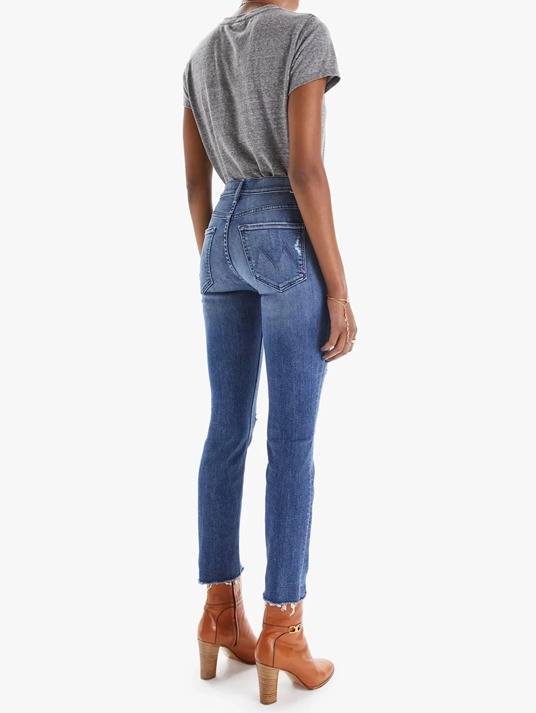 Off the grid. Mid-rise jeans with a straight leg, ankle-length inseam and a frayed hem. Cut from stretch denim, Weekend Warrior is a mid-blue wash with whiskering, fading and distressing throughout. Road trip approved.