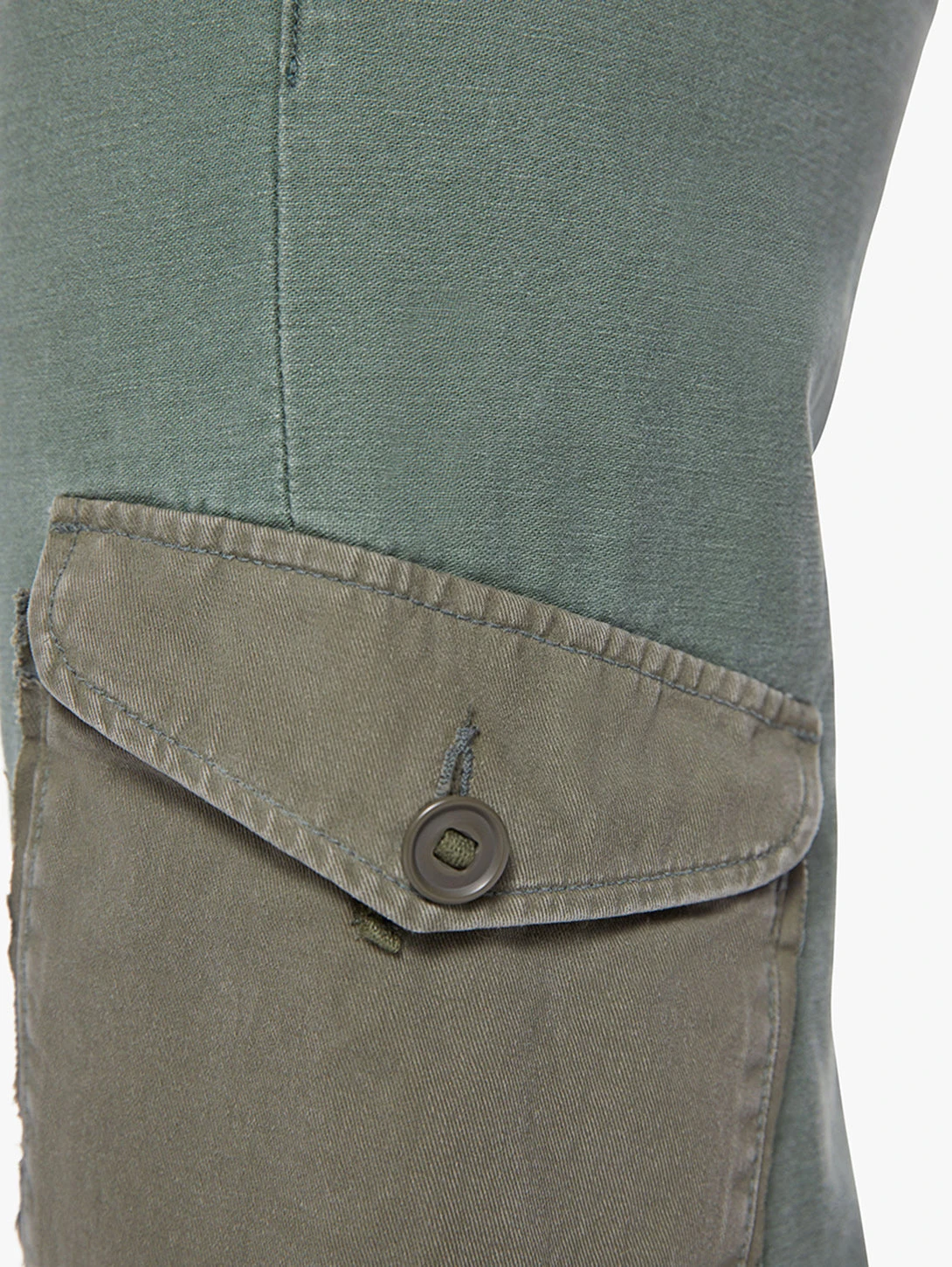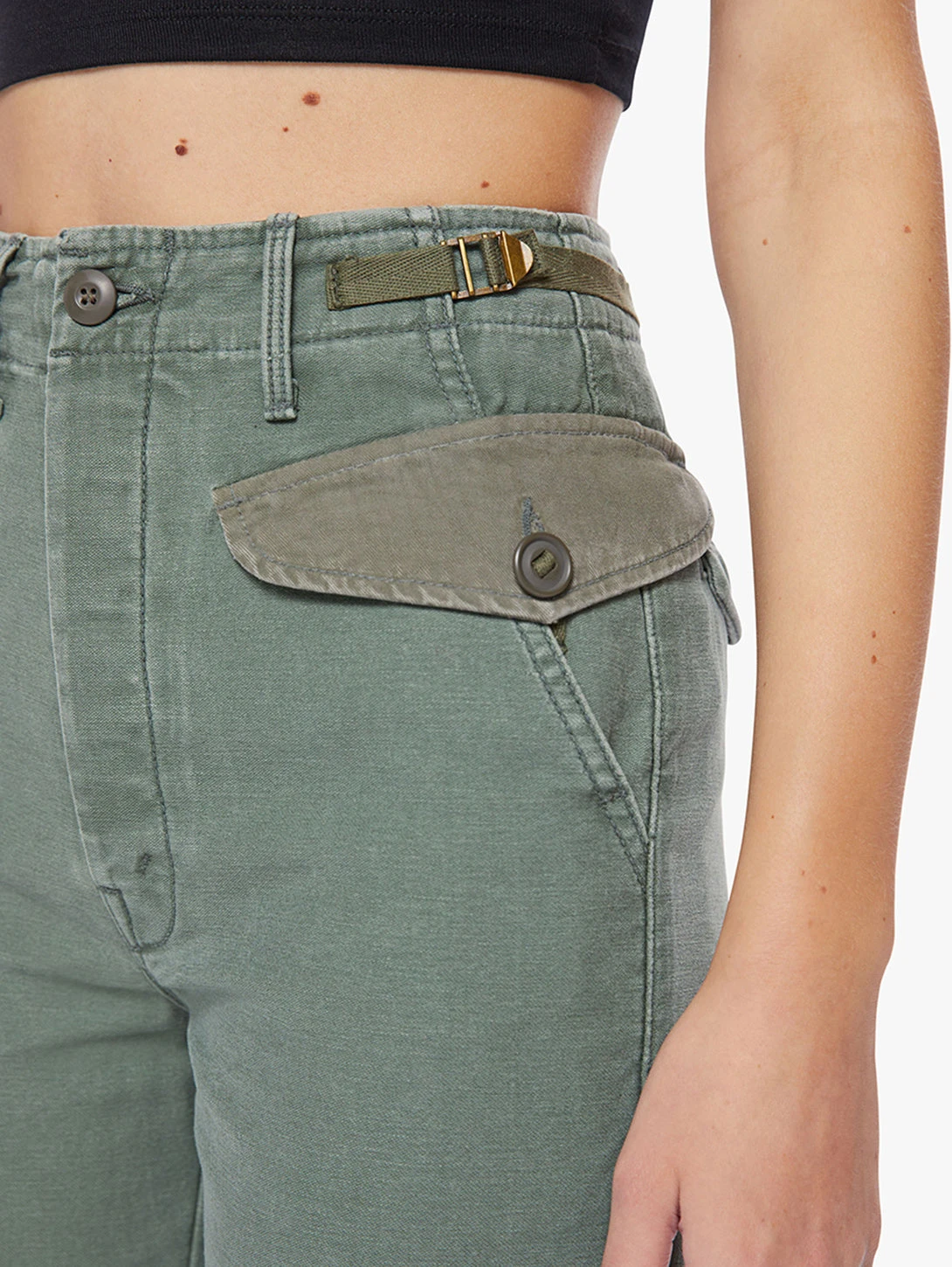 Roger that. Military-inspired cargo pants with a super high rise, patch pockets, a 30-inch inseam and buttons on the hem. Made from 100% cotton, On The Double is an army-green hue with pockets made from deadstock fabric.