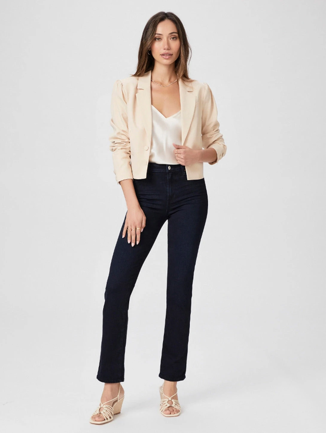 This high-rise, perfectly straight jean is lean through the leg with a 30″ inseam. Cut from our TRANSCEND VINTAGE denim in a dressier dark wash with a coin pocket detail, this style has the look of authentic vintage denim but is incredibly comfortable with plenty of stretch and recovery.