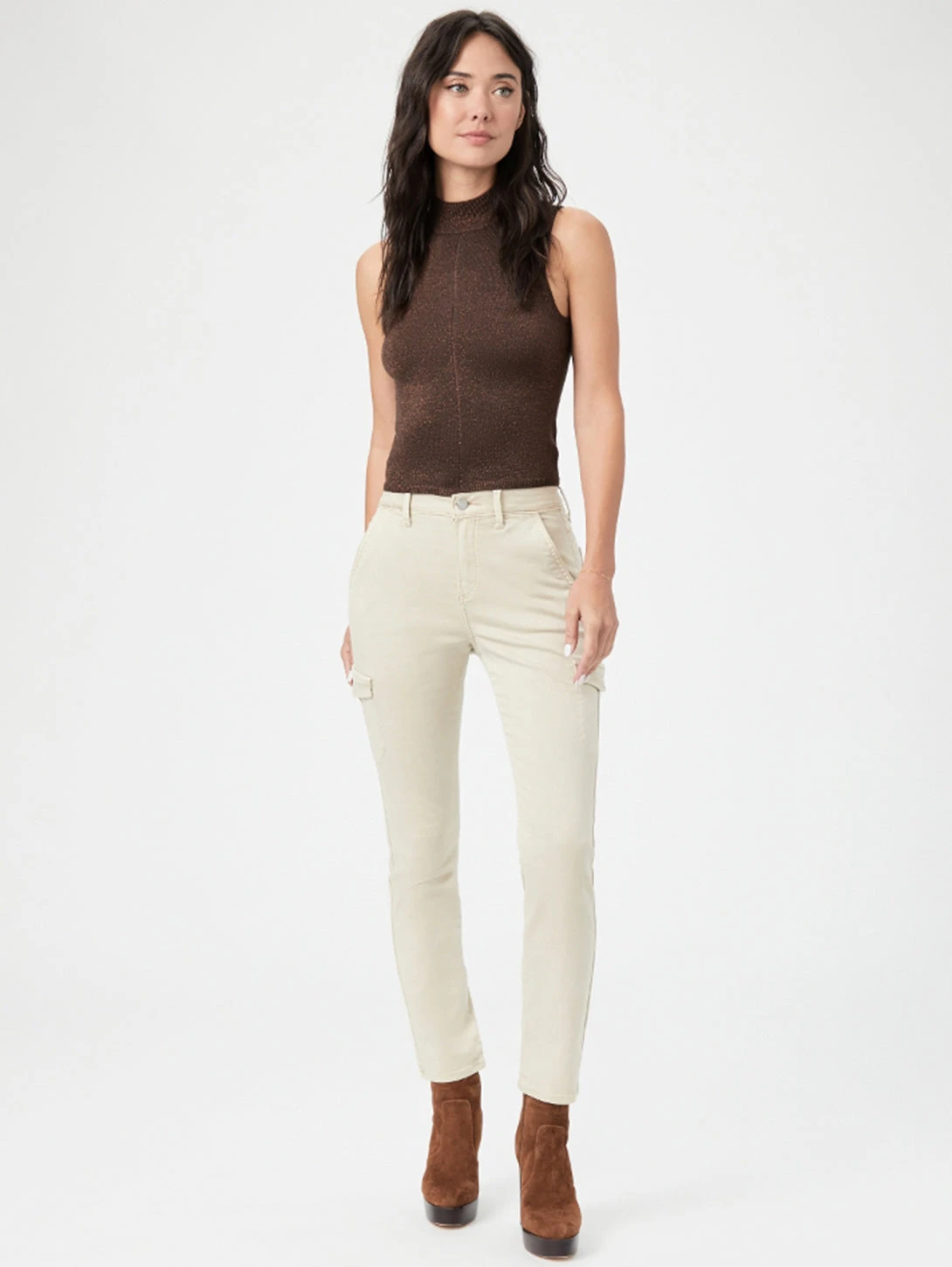 Jolie, our new feminine take on the utilitarian trend. This slim high-rise style comes in a neutral sand hue and features front trouser pockets and sleek cargo pockets. Finishing at the ankle, Jolie pairs perfectly with elevated sneakers or your favourite heels.