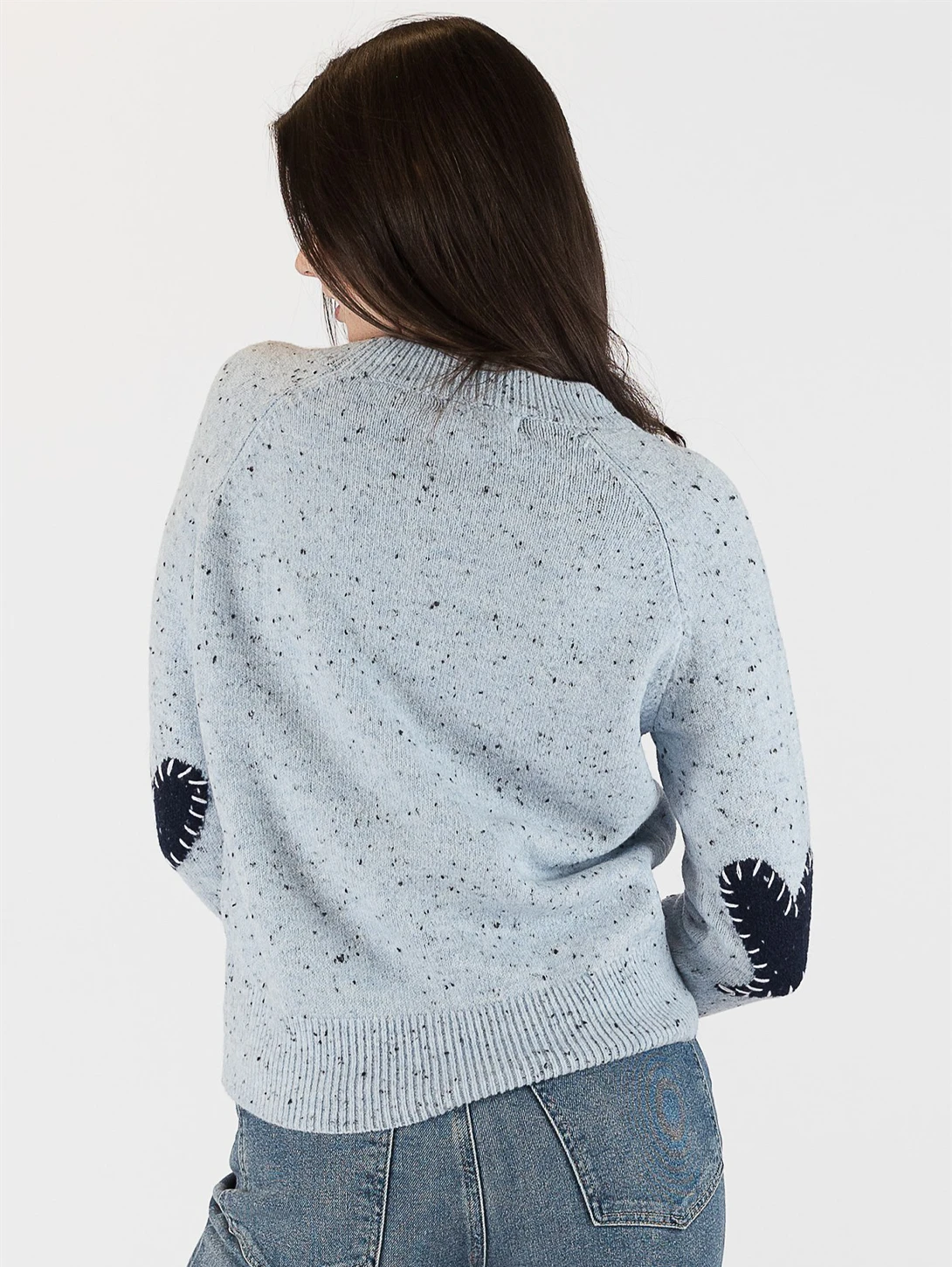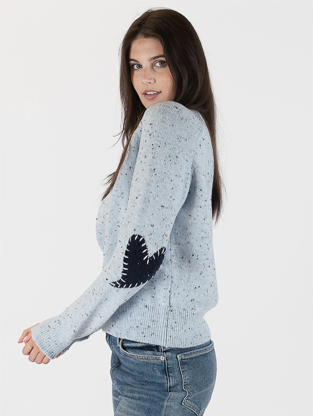 A charming and playful addition to your sweater collection. This sweater combines classic design elements with a touch of whimsy, creating a delightful and stylish look. One of the standout features of this sweater is the heart patch detail at the elbows. The heart patch adds a sweet and unique touch, bringing a pop of color and personality to the garment. It showcases your playful side and adds a charming accent to your outfit.
