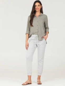 The Pocket Jogger is an everyday pant with a drawstring waist, cuffed ankles and side and back pockets.