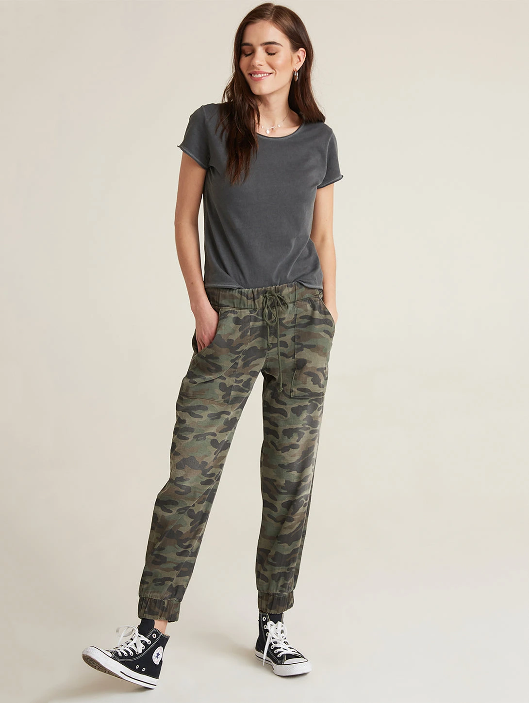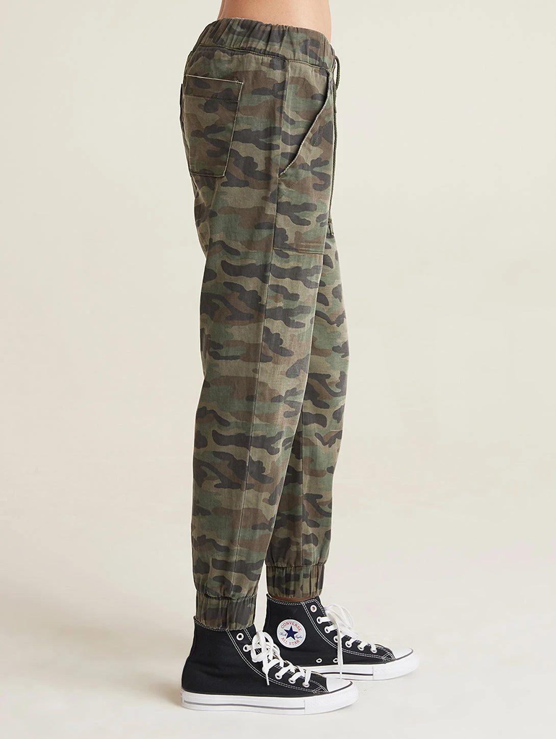 Jog in style. This is a pocket jacket pant made from comfortable fabric and fit in a vintage camo wash. It features a drawstring waist, elastic cuffs, back pockets, and front pockets with side seam entry.