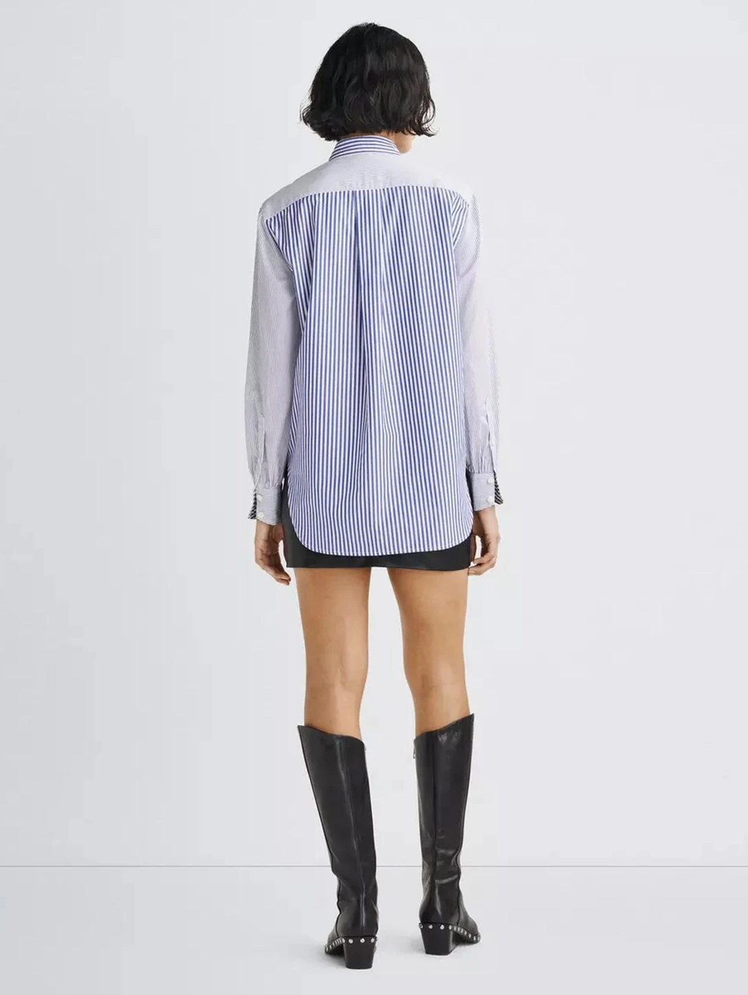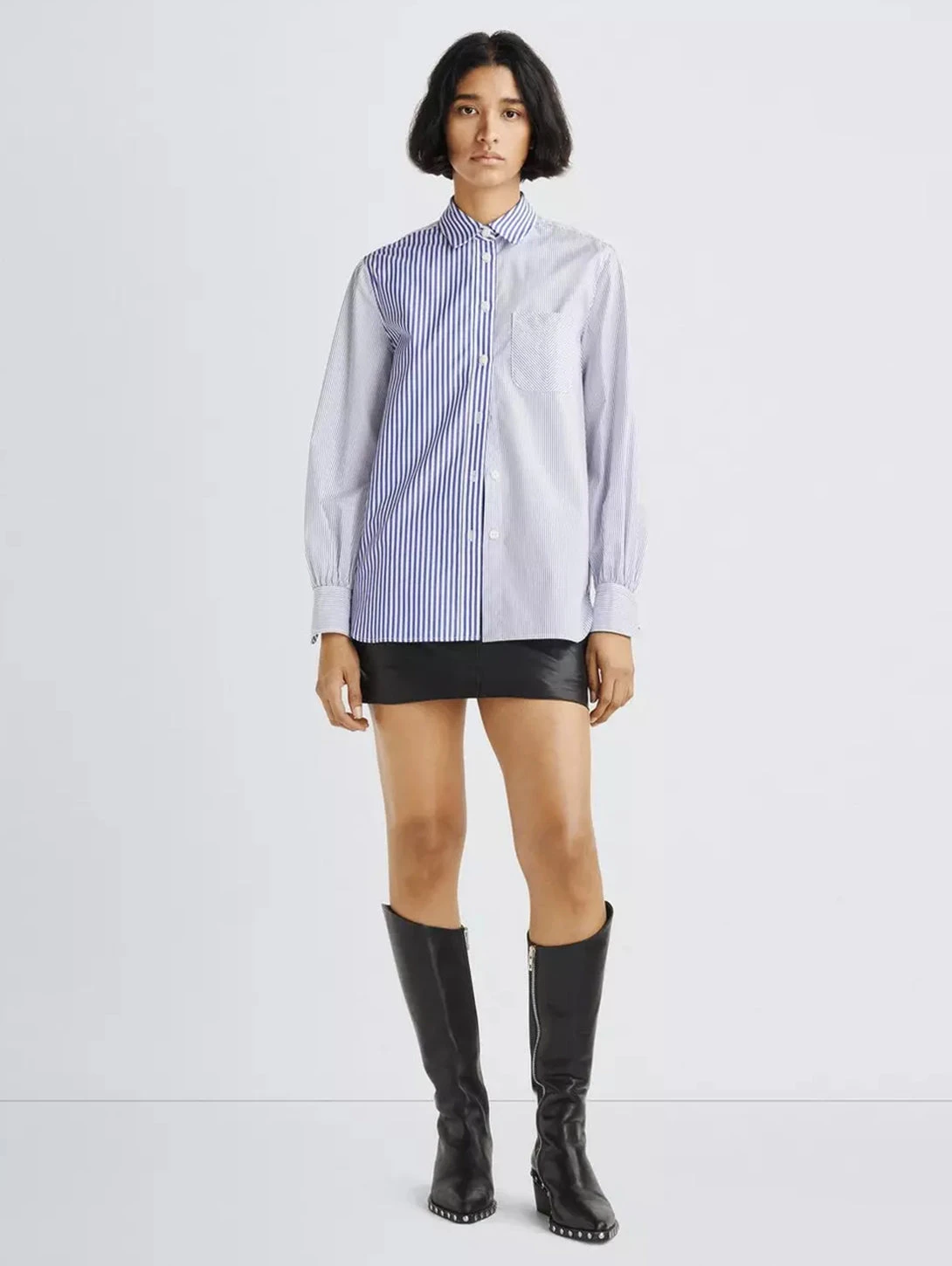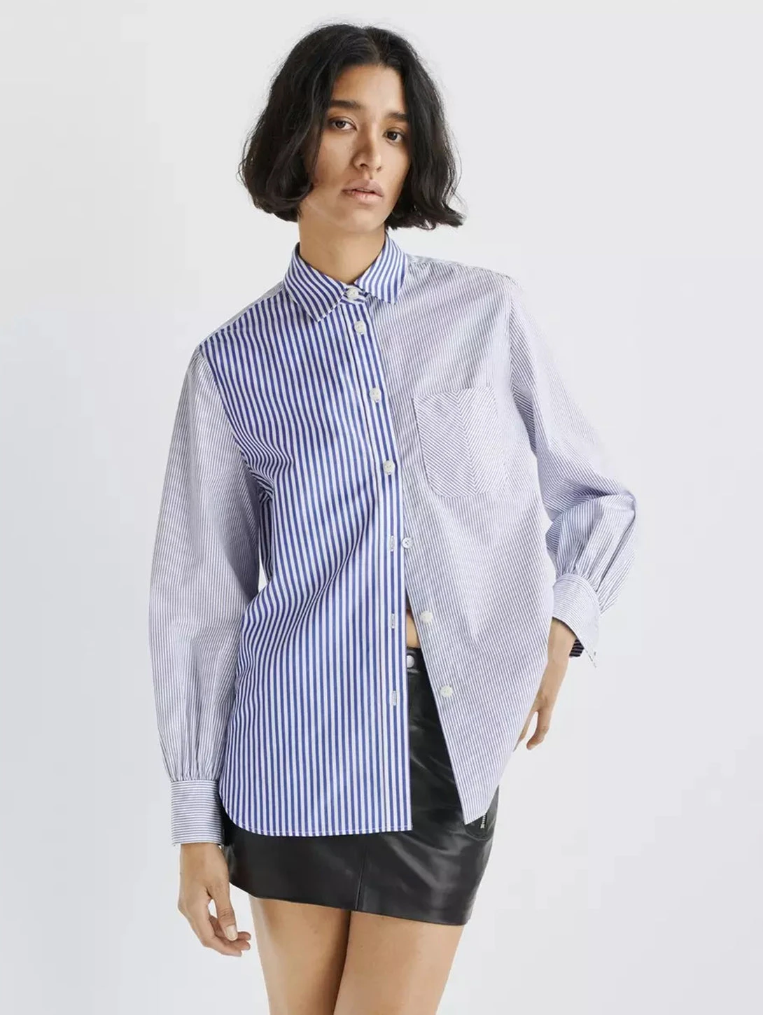 Timeless. Authentic. Iconic. One of the building blocks of a perfect wardrobe. A true wardrobe staple, this poplin button down Icon is a classic, perfected. Featuring banker stripes and a chevron front pocket detail for added dimension. Subtle gathering around the cuffs gives this traditionally masculine shirt a subtly feminine touch. Pairs perfectly under a sweater-vest or military jacket. Crafted from 100% cotton with a relaxed fit.