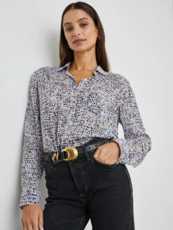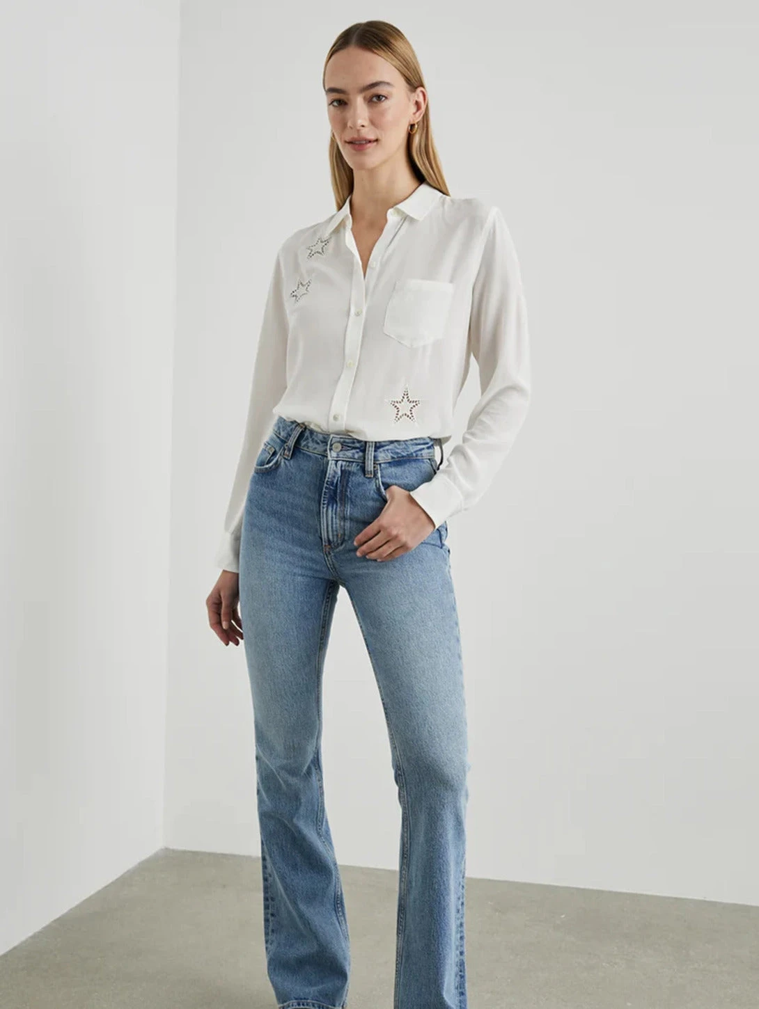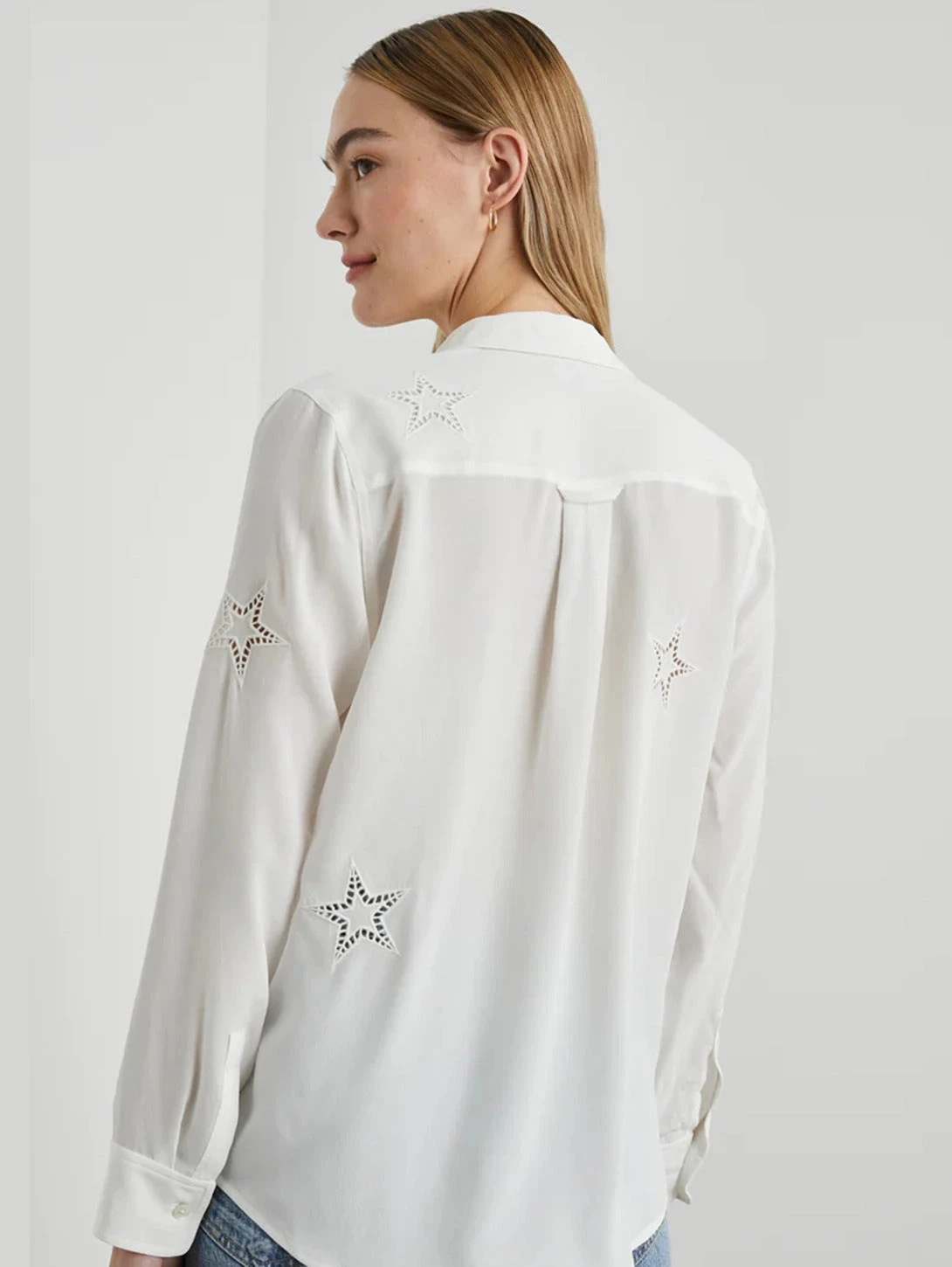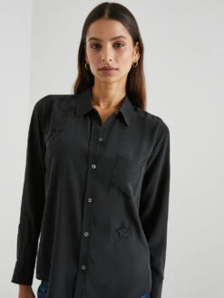 This classic design features a playful, embroidered star print mixed with a luxe, elevated fabrication to create a timelessly polished look. Made from washed silk, this button-down tailored top features a single front pocket.