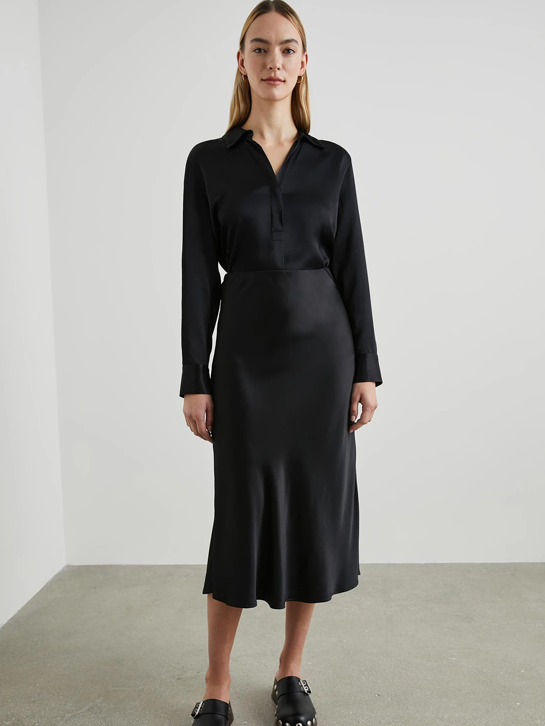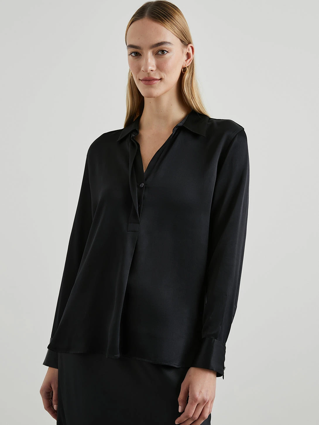 Luxe satin crepe, long sleeve, black collared pullover top featuring concealed half placket, flattering split side seams, and curved shirttail. Look refined and polished from work to weekend in this classic style.