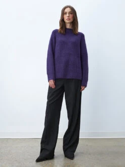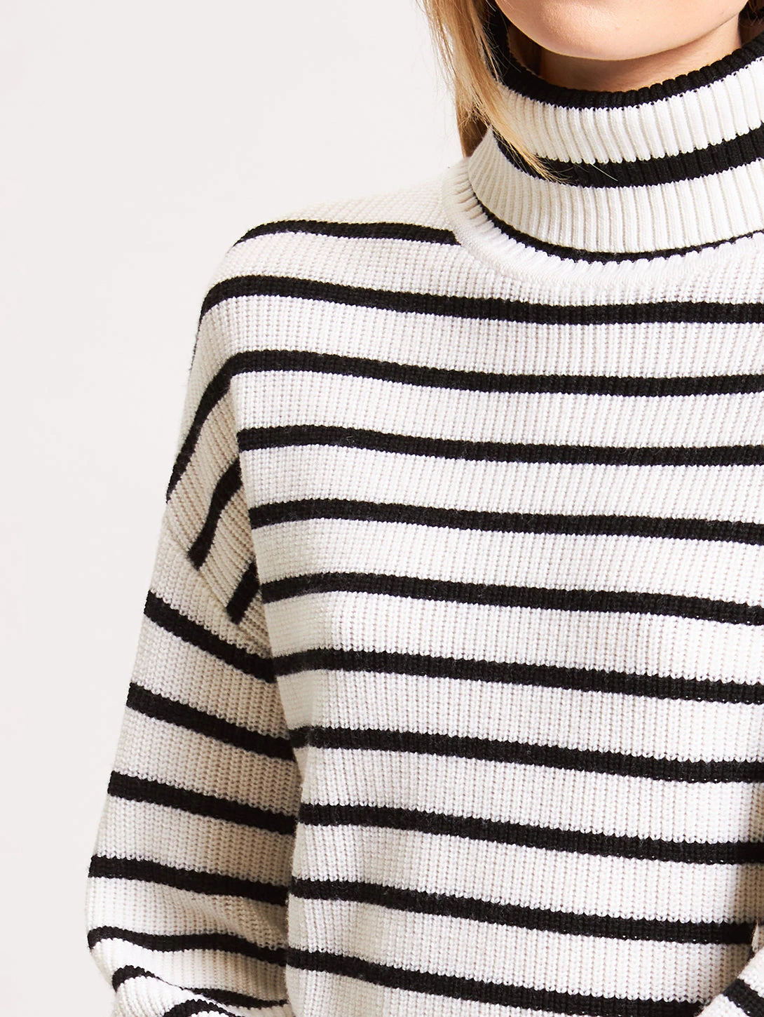 This ribbed turtleneck is knit in a classic fit, slightly cropped and is crafted from a soft, extra-fine merino wool. This timeless piece features an elegant stripe, drop shoulder and ribbed trims. Wear with tailored pants or your favourite denim!
