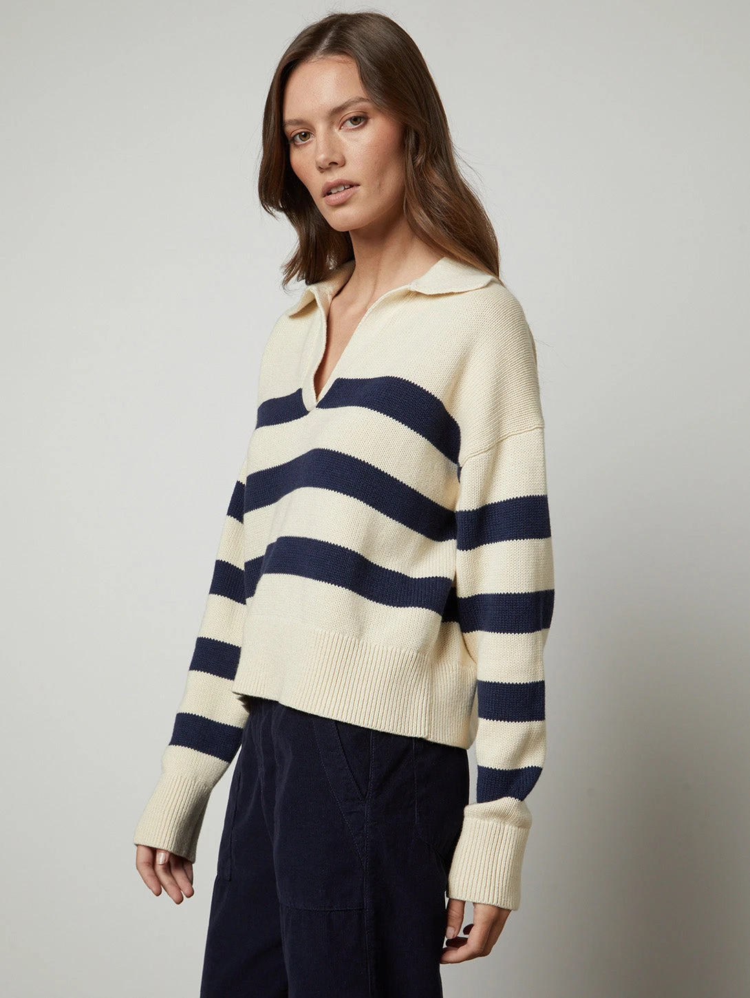 A perfect sweater for those in-between days in on-point stripes. Crafted from a luxe and lightweight cotton/cashmere blend and with a ribbed V-neckline and soft collar. Great layered or solo.